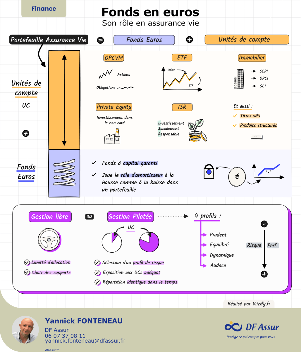Le portefeuille d'assurance vie se compose de fonds euros (capital garanti) et d’unités de compte (OPCVM, ETF, immobilier, ISR, private equity). Les fonds euros jouent le rôle d'amortisseurs, balançant le risque des unités de compte. Les gestionnaires choisissent entre une gestion libre (allocation libre) et une gestion pilotée (profil de risque : prudent, équilibré, dynamique, audace).